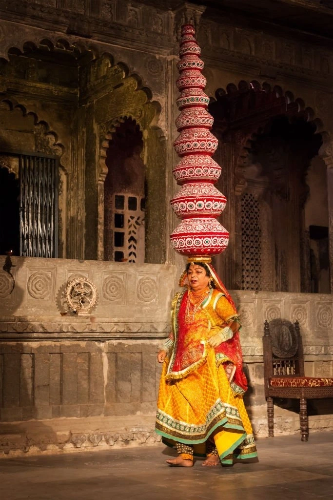2. BHAVAI: A Daring Dance Where Women Balance Multiple Pots On Their Heads Offen Performed On Swords Or Glass Showcasing Extreme Balance And Elegance.